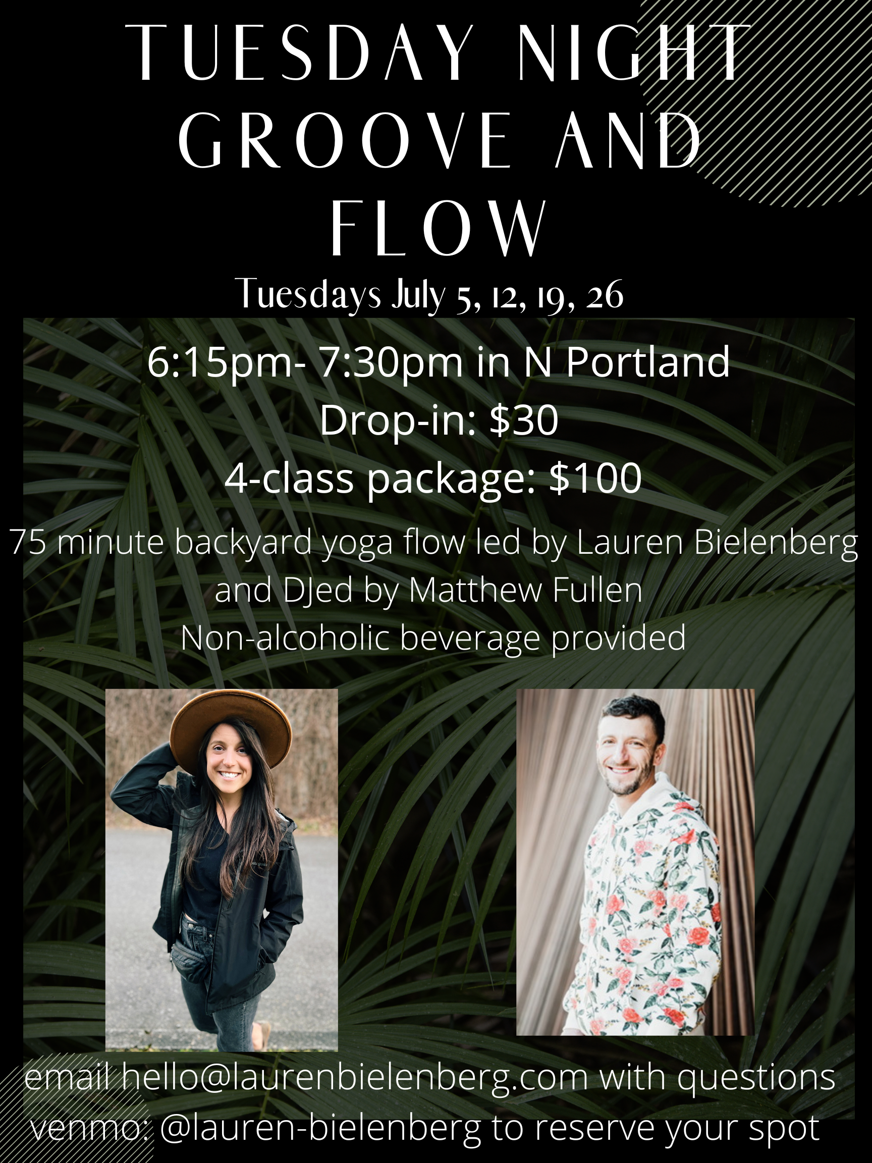 For the month of July, all Tuesday evenings, a fun strength and flow yoga class will be lead by myself with upbeat tunes provided by DJ Matthew Fullen! This will be outdoors in a backyard in North Portland near Kenton, OR.